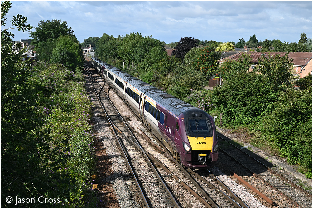 222009 and 222019 pass Beeston with 5B28 0829 Derby Etches Park Depot to Nottingham ECS. Date: 29 July 2023 Manipulation Notes: None