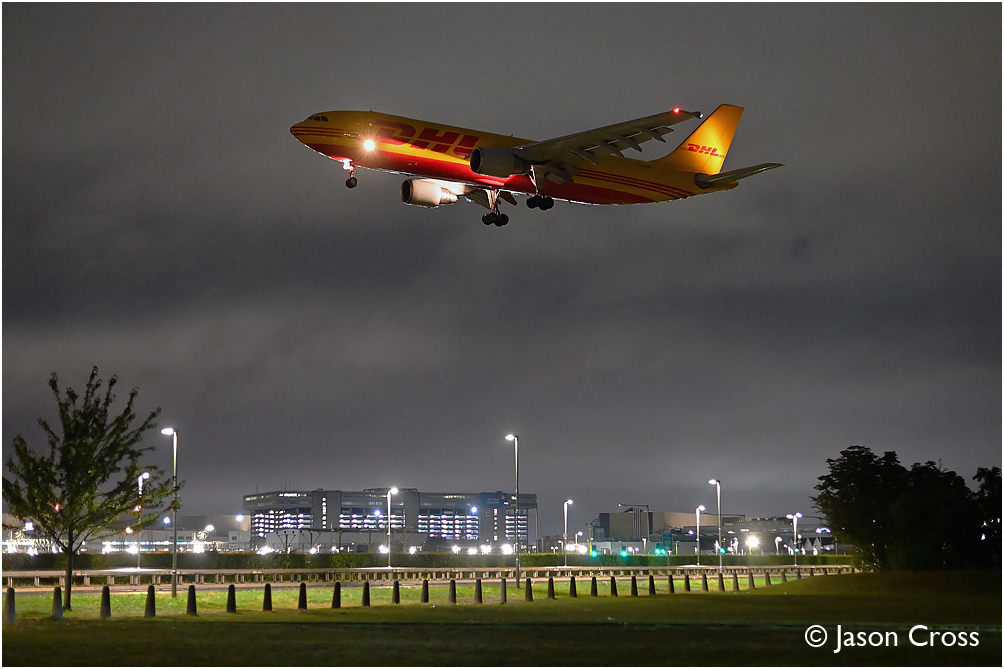 DHL Airbus A300 D-AEAN on final approach to runway 27L at London Heathrow with a positioning flight from Luton. Date: 29 August 2023 Manipulation Notes: None