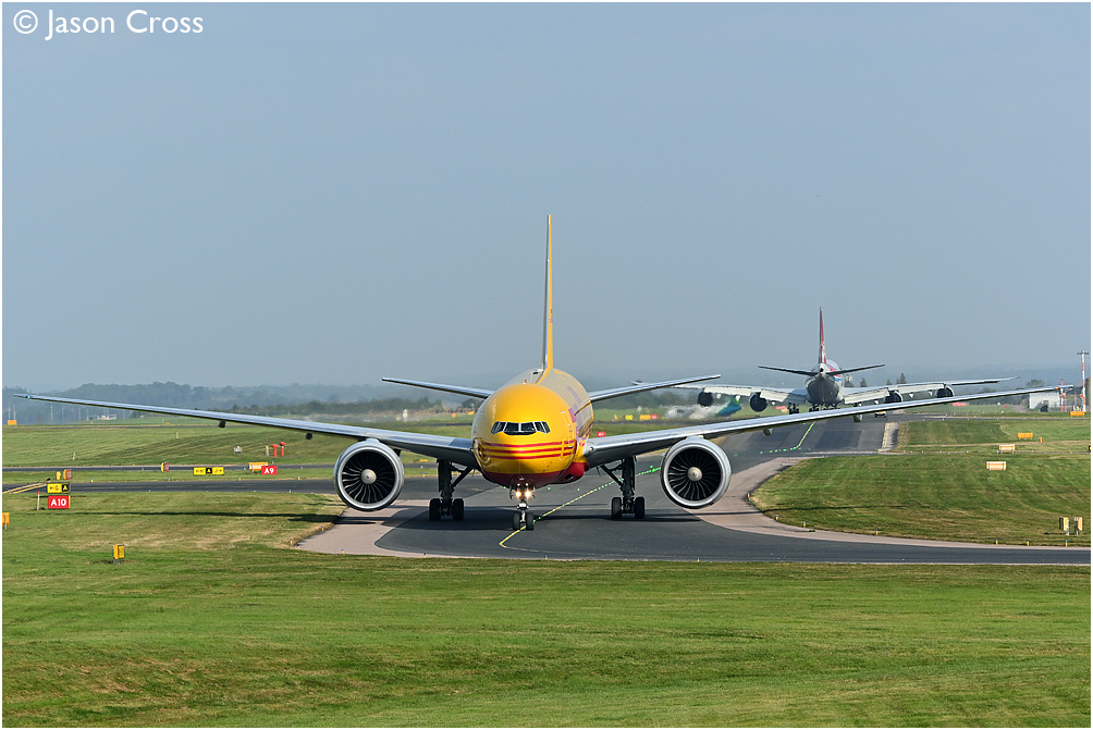 DHL Boeing 777 G-DHLW taxiing to the DHL terminal at East Midlands Airport having just landed with a cargo flight from Cincinnati.