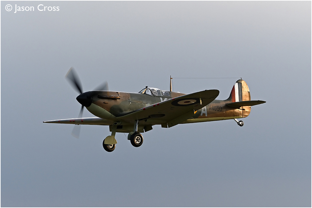 Coming in to land after the 'Duxford Big Wing' flypast; Spitfire MkI X4650. Imperial War Museum Duxford, Battle of Britain Airshow 2023. Date: 16 September 2023 Manipulation Notes: None