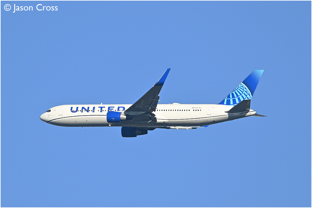 United Airlines Boeing 767 N657UA lines up on Heathrow's runway 27L with flight UAL924 from Washington. Photo taken from Wimbledon Common. Date: 22 October 2023 Manipulation Notes: None