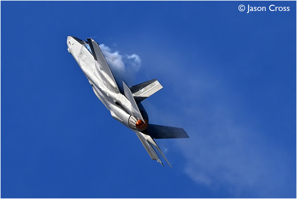 USAF F35A 20-5583 starts to create its own cloud as it quick climbs away from RAF Lakenheath. Date: 8 December 2023 Manipulation Notes: None