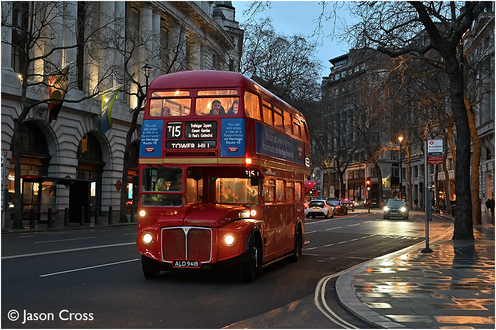 Routemaster RM1941 at the Aldwych with a Trafalgar Square to Tower Hill T15 service. Date: 30 December 2023 Manipulation Notes: None