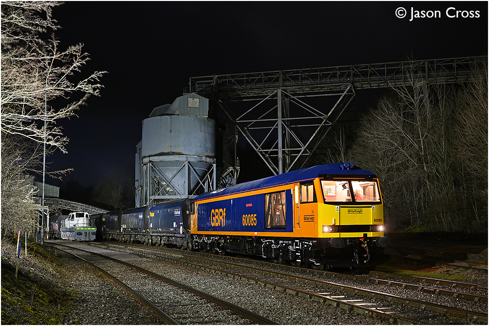 GB Railfreight's 60085 'Snowdon' on a rake of hoppers at Swinden Quarry in Yorkshire. Alongside is FRS built diesel shunter 'Cracoe'. (charity photo shoot organised by Chris Gee) Date: 23 March 2024 Manipulation Notes: None