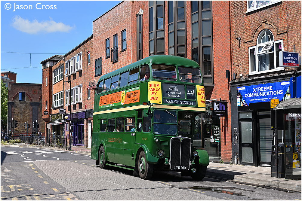 AEC Regent III RT3491 on Oxford Street High Wycombe with a 441 service from High Wycombe to Slough. High Wycombe Classic Bus Running Day (organised by the Amersham & District Motorbus Society). Date: 2 June 2024 Manipulation Notes: None