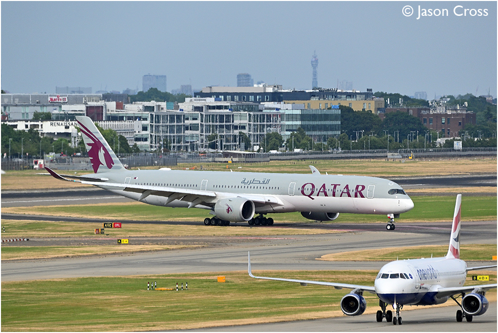 with flight QR1 from Doha while British Airways Airbus A320 G-EUYP taxies in