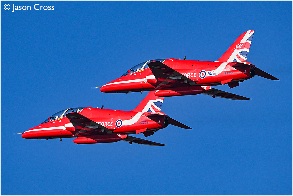 Red Arrow Hawk T1s XX232 and XX310 get airborne from RAF Waddington for some synchro pair practice. Date: 4 March 2025 Manipulation Notes: None