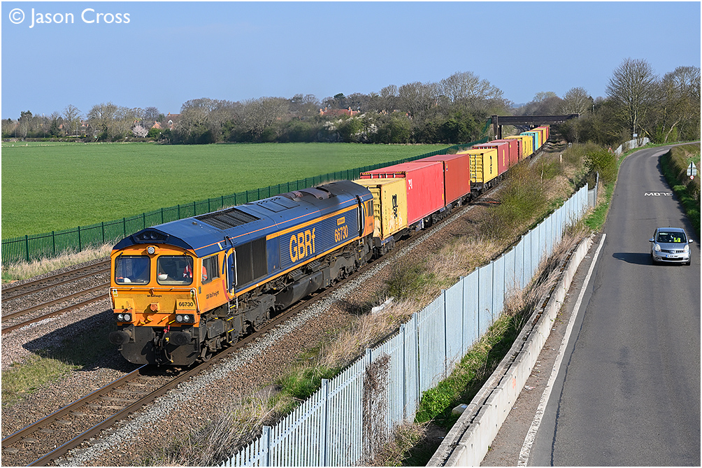 66730 'Whitemoor' at Thurmaston working the 4M78 0538 Felixstowe North to Hams Hall container train. Date: 3 April 2025 Manipulation Notes: None Camera mounted on a tall pole and remotely fired