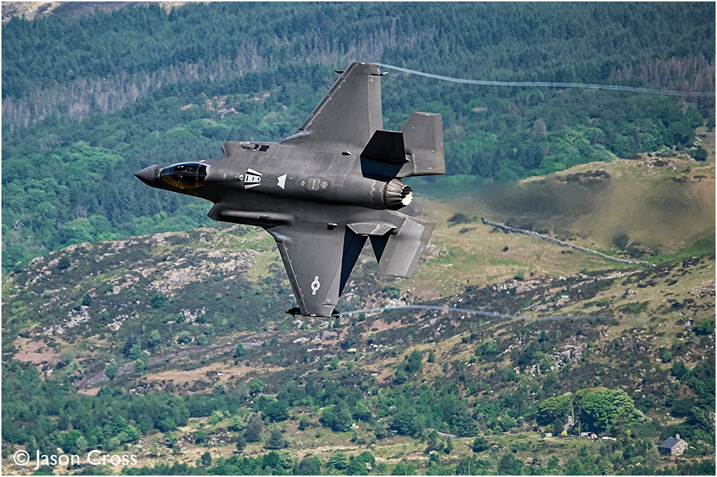 USAF Lockheed Martin F35A Lightning II 19-5495 passes through Bwlch and banks left to head for the Cad Pass in the Mach Loop. (ROMAN flight, two-ship of F35As from RAF Lakenheath). Date: 13 May 2025 Manipulation Notes: None