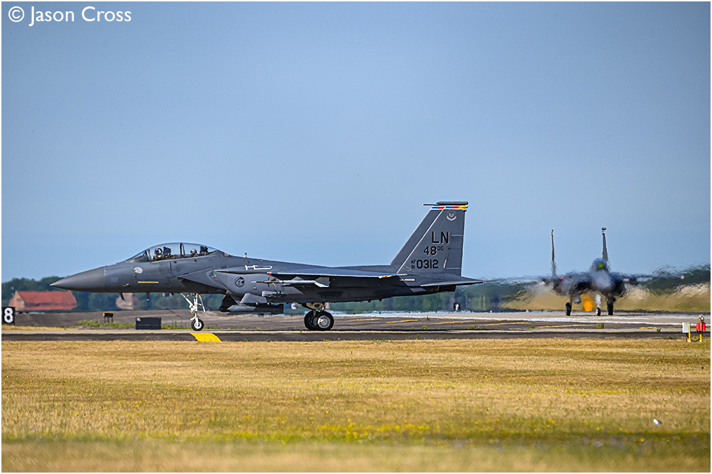 USAF McDonnell Douglas F15E 'Strike Eagle' 91-0312 taxies off the runway after landing at RAF Lakenheath. Date: 30 June 2025 Manipulation Notes: None