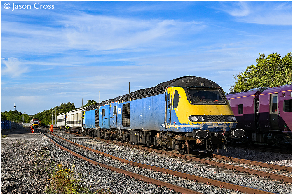 43423 and 43467 have formed up the two barrier vehicles used to bring 398019 to Asfordby Test Centre and are being readied to depart with a 6G39 2039 Asfordby Test Centre to Kings Norton Depot. Date: 8 July 2025 Manipulation Notes: None