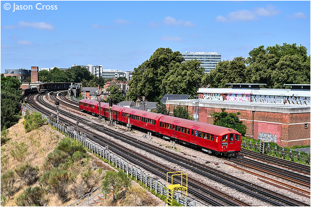 of 1938 Tube Stock 10012-012256-12048-11012 passes Chiswick Park while working