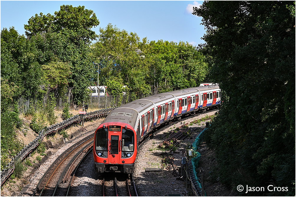 S Stock 21370 branches left at Hanger Lane Junction and drops down to Ealing Broadway with a District Line service from Upminster. Date: 13 July 2025 Manipulation Notes: None