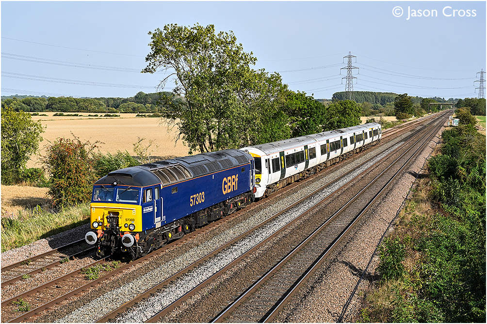 57303 has 387101 in tow as it approaches Loughborough running as a 5Q42 1419 Hornsey Depot to Derby Litchurch Lane. Date: 13 August 2025 Manipulation Notes: None