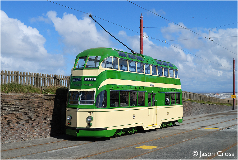 717 passes Bispham with a special working carrying civic dignitaries to the Fleetwood Tram Sunday event. In the background can be seen the M/V Riverdance lying on its side on the beach near Cleveleys. Date: 20 July 2008 Manipulation Notes: None