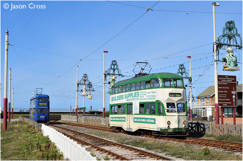 Passing trams at Starr Gate, 712 on Cleveleys service and 724 on Fleetwood service. Date: 28 August 2009 Manipulation Notes: None