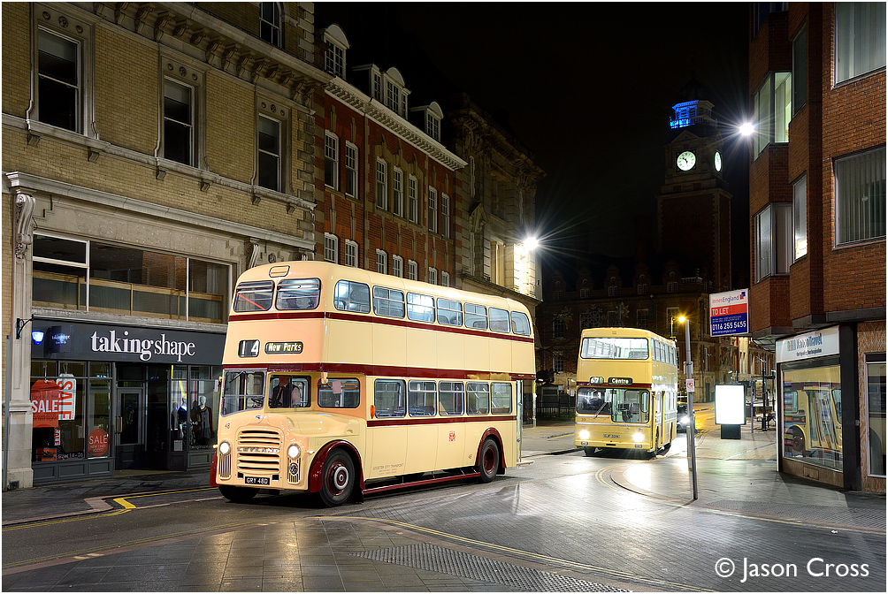 Leyland PD3 number 48 and Scania Metropolitan 301 on Horsefair Street in Leicester. EMRPS photo shoot. Date: 11 January 2015 Manipulation Notes: None