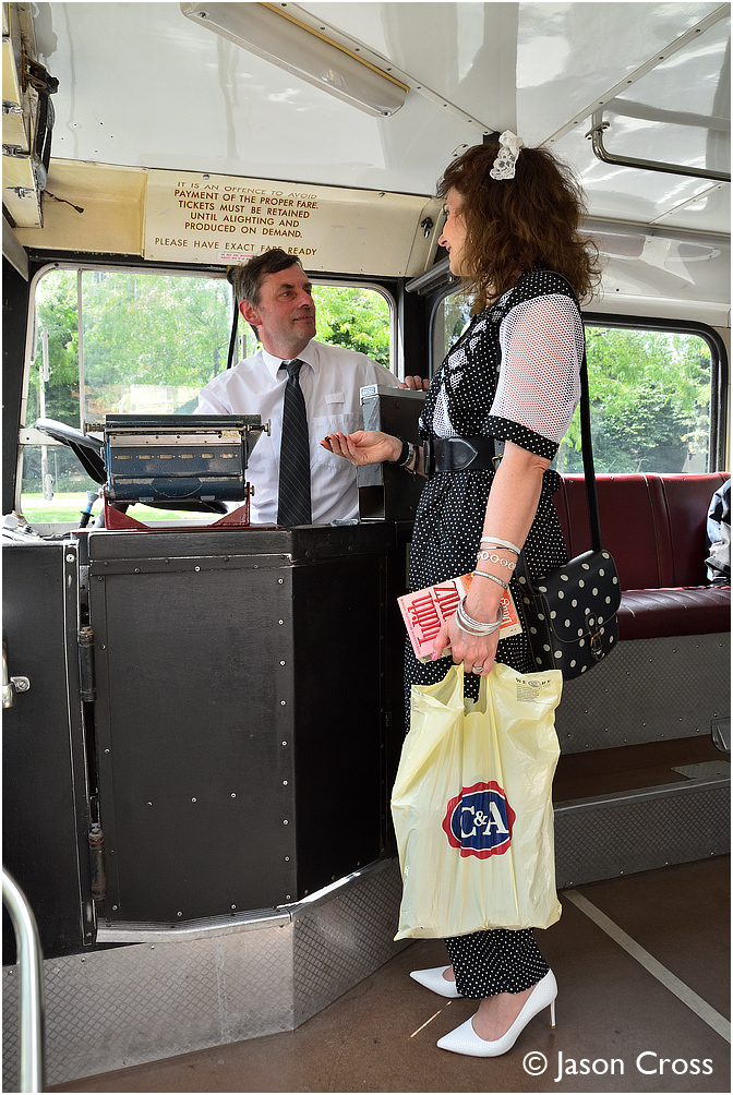 Fares please! Dianne boards Scania Metropolitan 301 having been shopping in C&A's. EMRPS / LTHT Leicester City Transport bus photo shoot. Date: 13 August 2017 Manipulation Notes: None