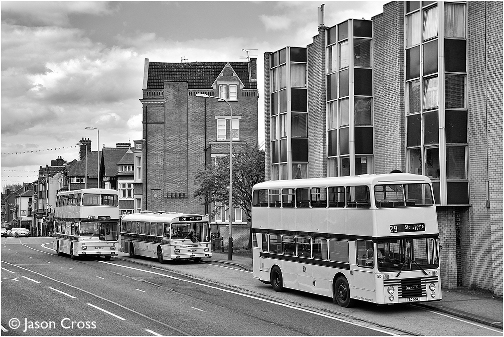 At the top of London Road, 301 overtakes 50 and 225. EMRPS / LTHT Leicester City Transport bus photo shoot. Date: 13 August 2017 Manipulation Notes: None