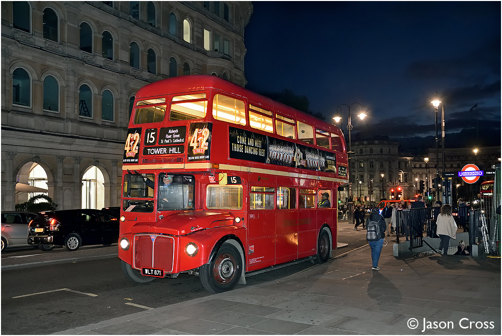 After taking a break, RM871 prepares to set off from Trafalgar Square with a 15 for Tower Hill. Date: 22 October 2017 Manipulation Notes: None