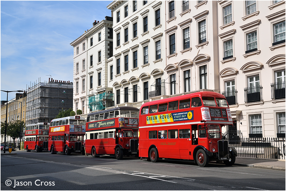 RT4779, STL441, RT1 and STL2377 parked up in Eaton Gate in London. RT1's 80th birthday road trip. Date: 24 August 2019 Manipulation Notes: None