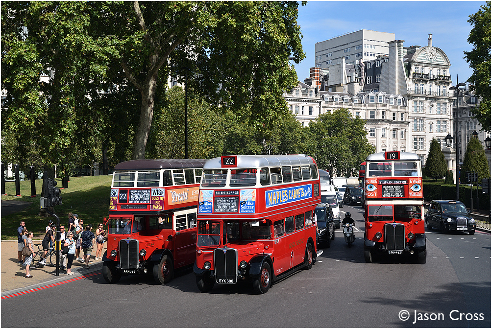 STL441, RT1 and STL2377 make their way through Duke of Wellington Place in London. RT1's 80th birthday road trip. Date: 24 August 2019 Manipulation Notes: None