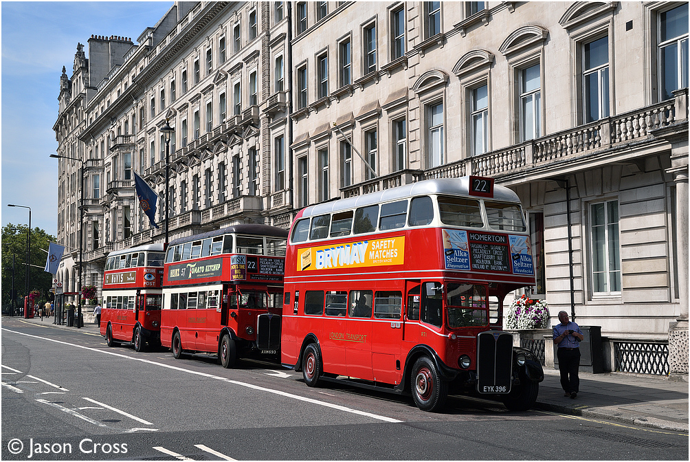 RT1, STL441 and STL2377 on Piccadilly in London. RT1's 80th birthday road trip. Date: 24 August 2019 Manipulation Notes: None