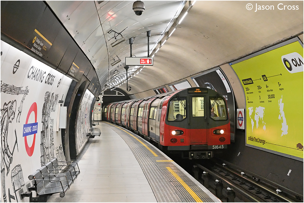 51645 leads an Edgware to Morden service into Charing Cross. Due to a part closure of the Bank branch, the Charing Cross branch was being operated by trains running between Edgware and Morden. Date: 22 February 2020 Manipulation Notes: None