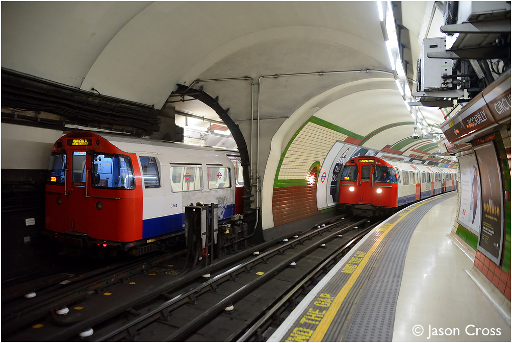 Passing 1972 Stock trains (3563 and 3544) at Piccadilly Circus on the Bakerloo Line. Date: 19 October 2013 Manipulation Notes: None