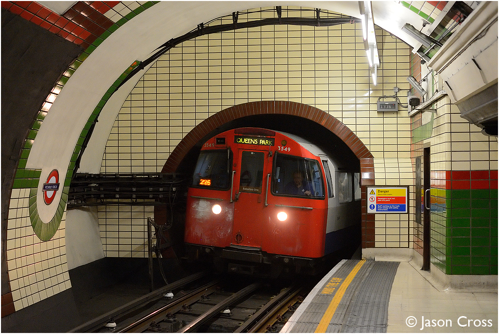 3549 leads a train of 1972 Stock into Piccadilly Circus with a Bakerloo Line service for Queen's Park. Date: 4 October 2014 Manipulation Notes: None