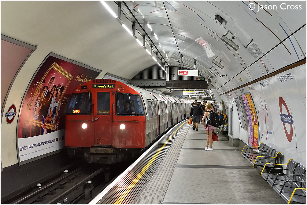 Looking like it's just been dug up, a train of 1972 Tube Stock led by 3560 arrives at Embankment with an Elephant & Castle to Queen's Park Bakerloo Line service. Date: 22 July 2018 Manipulation Notes: None