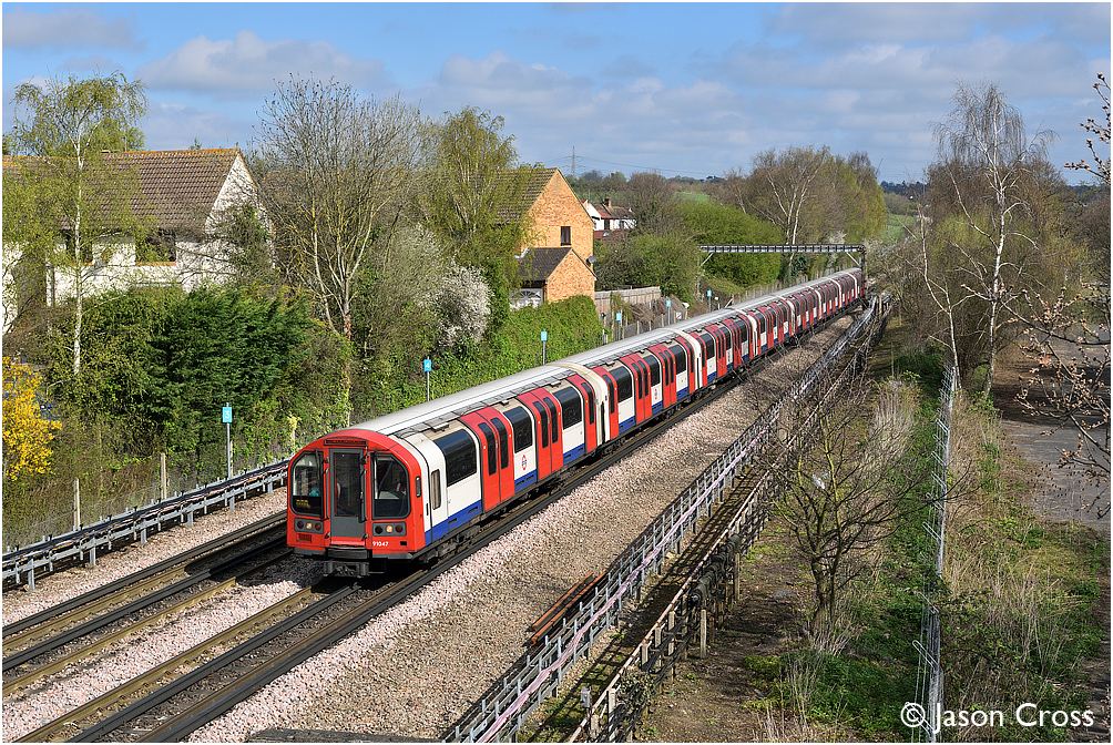 91047 approaches Theydon Bois with train 20, the 1039 Epping to West Ruislip Central Line service. Date: 2 April 2017 Manipulation Notes: None Camera mounted on a tall pole and remotely fired