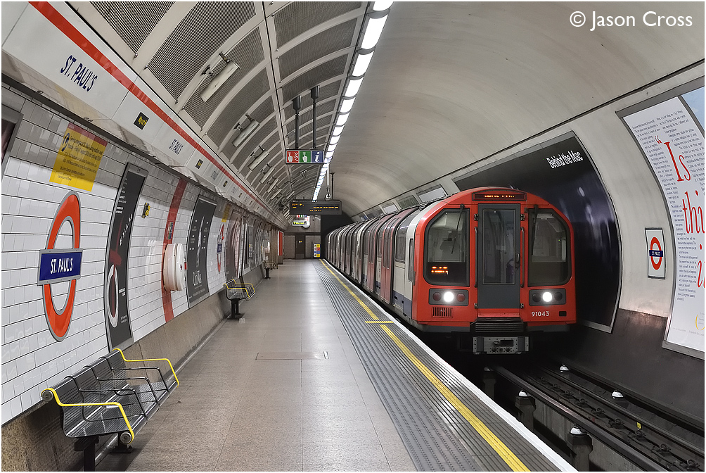 91043 leads a Hainault to White City Central Line service at St Paul's. Date: 8 September 2018 Manipulation Notes: None