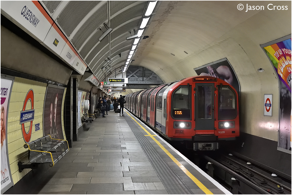 91119 arrives at Queensway with an Ealing Broadway to Woodford via Hainault Central Line service. Date: 26 January 2019 Manipulation Notes: None