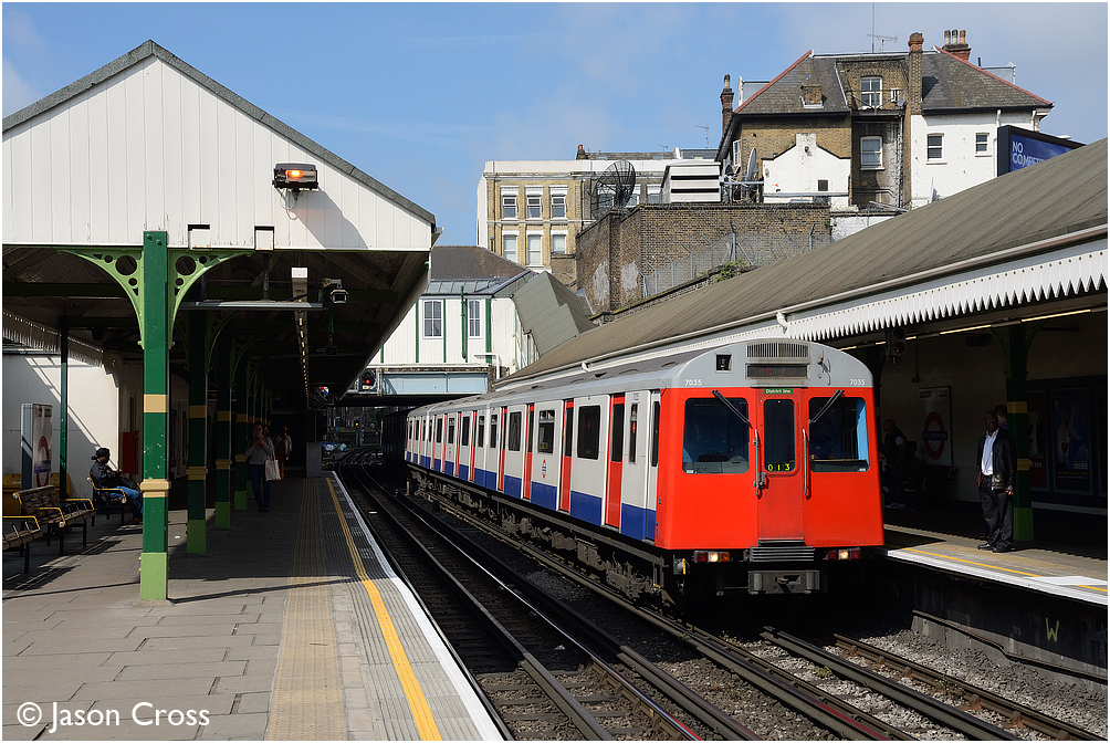 7035 arrives at West Kensington with an eastbound District Line service for Whitechapel. Date: 30 June 2013 Manipulation Notes: None