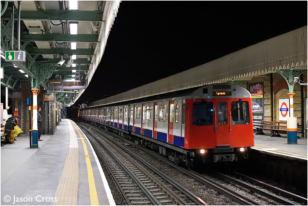 An Upminster bound train of D Stock arrives at Plaistow led by 7069. Date: 7 March 2015 Manipulation Notes: None