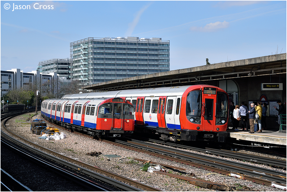 A train of 1973 Tube Stock overtakes a larger train of sub-surface S Stock at Chiswick Park - not all trains on the London Underground are tube trains! Date: 2 April 2016 Manipulation Notes: None