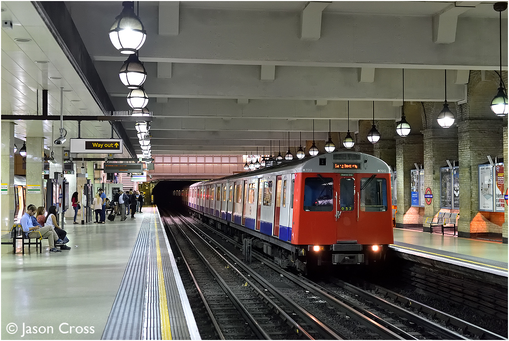 7012 arrives at Gloucester Road with a Tower Hill to Ealing Broadway District Line service. Date: 3 September 2016 Manipulation Notes: None
