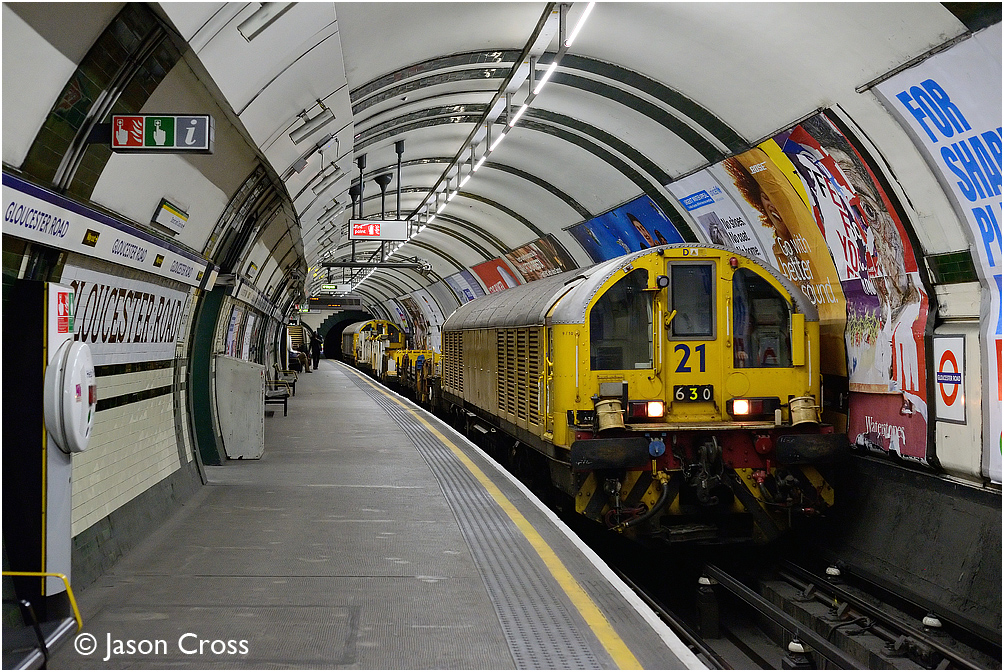L21 passes through Gloucester Road with train 630, an 0528 Caledonian Road to Ruislip Depot engineer's train. Date: 21 December 2013 Manipulation Notes: None