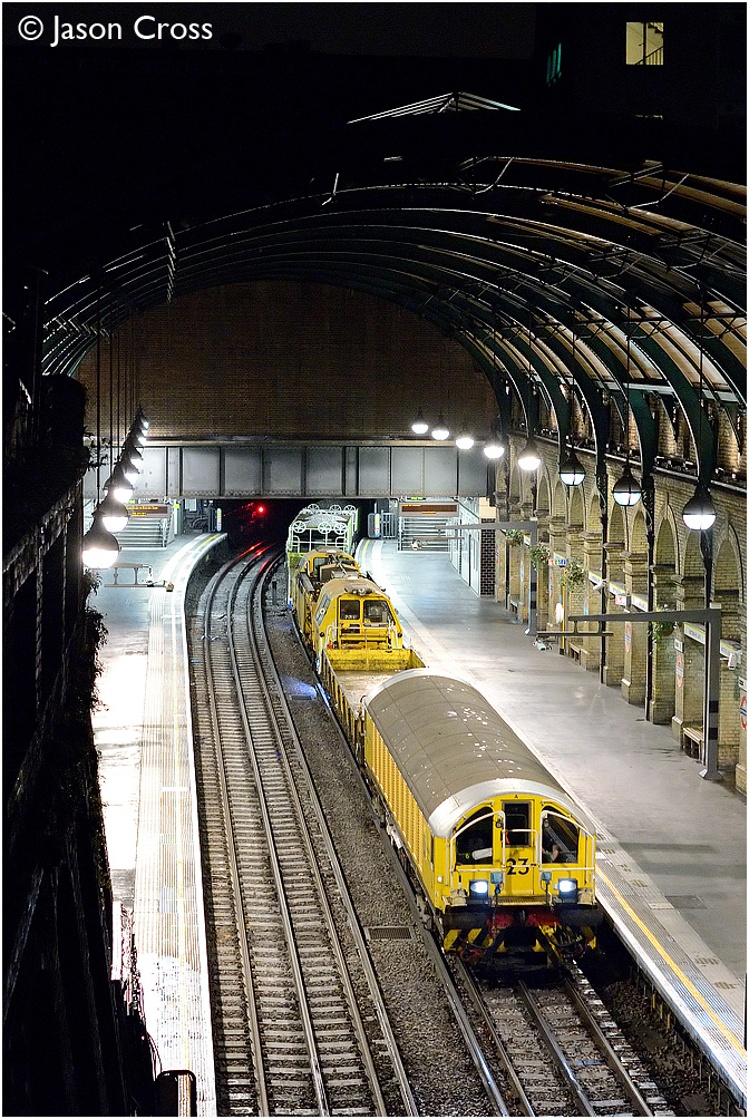 L23 passes through Notting Hill Gate with a Ruislip Depot to South Ealing engineer's train. Date: 14 October 2014 Manipulation Notes: None