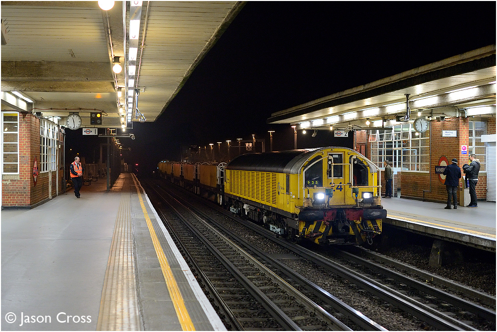 L24 passes through Rayners Lane with a Ruislip Depot to Becontree ballast train. Date: 20 November 2014 Manipulation Notes: None