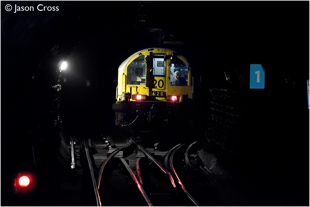 L20 is on the rear of a Ruislip Depot to Euston (City) engineer's train as it branches off of the Piccadilly Line and onto the Northern Line at King's Cross St Pancras. Picture taken with permision. Date: 11 March 2015 Manipulation Notes: None