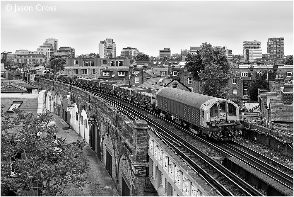 L54 is on the rear of an engineer's train running 'bang road' in an engineering possession at Putney. Date: 29 May 2016 Manipulation Notes: None Camera mounted on a tall pole and remotely fired