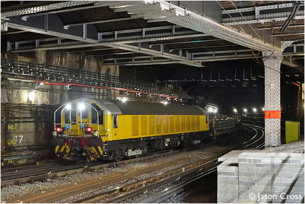 After working from Ruislip Depot to Edgware Road, train 551 enters the possession and arrives 'bang road' at Paddington (Suburban) headed by battery loco L46. Date: 12 August 2017 Manipulation Notes: None