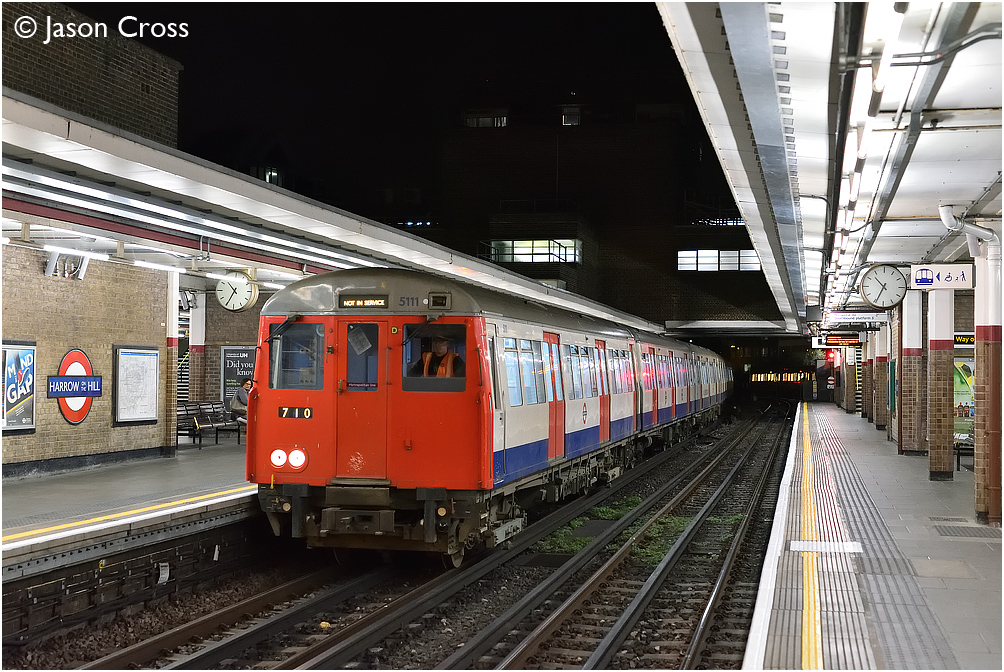 The A Stock Rail Adhesion Train exits Harrow Siding and enters platform 4 at Harrow-on-the-Hill prior to reversing and heading north to Amersham. Date: 10 October 2017 Manipulation Notes: None