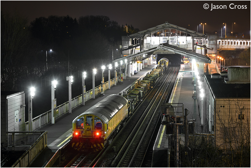wagons that has completed its overnight work dropping rails between Uxbridge and