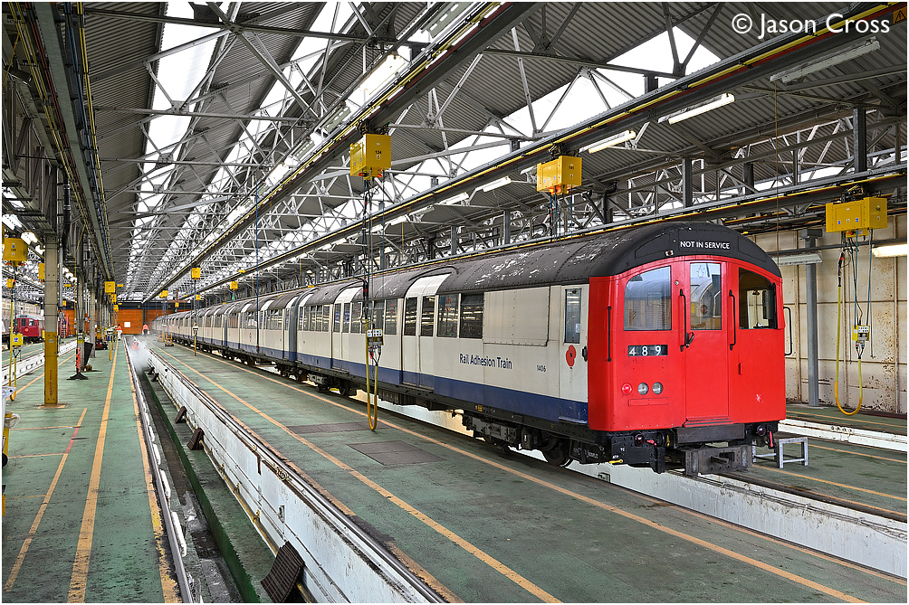 The 1962 Tube Stock 8-car Rail Adhesion Train is captured between duties in Ruislip Depot. Photo taken during an authorised visit. Date: 14 December 2019 Manipulation Notes: None