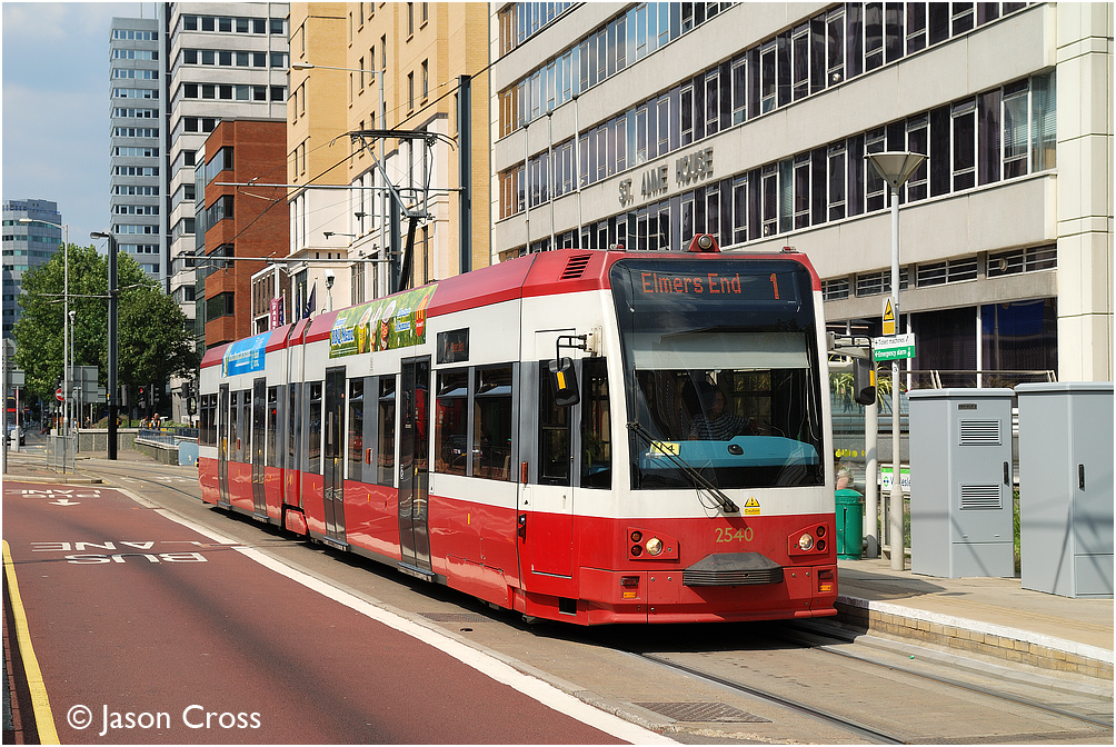 2540 at the Wellesley Road tram stop in Croydon with a line 1 West Croydon to Elmers End service. Date: 11 August 2006 Manipulation Notes: None