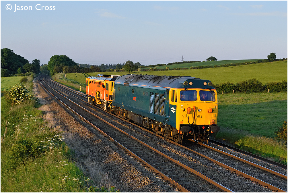 In the last dregs of light, 50007 'Hercules' makes a fine sight passing Rearsby with a 6Z25 1903 Ely Reception Sidings to Washwood Heath. Date: 23 June 2015 Manipulation Notes: None Camera mounted on a tall pole and remotely fired