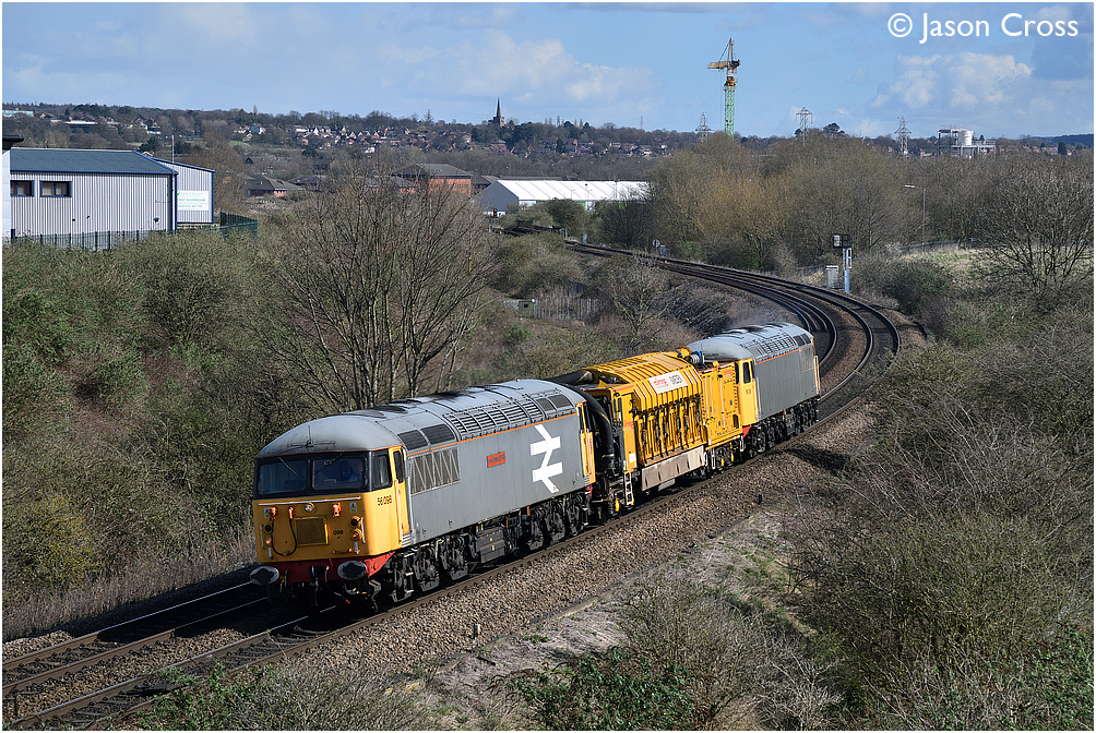 56098 and 56081 approach Derby at Wilmorton with a 6X23 1030 Leicester LIP to Doncaster Up Decoy railvac move. Date: 21 March 2017 Manipulation Notes: None